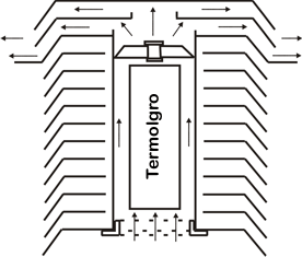 Al centro dei sottovasi ho praticato fori di 10 cm circa tranne che negli ultimi due. Ho deciso di intubare il sensore tramite un tubo in plastica lungo 20 cm e del diametro di 8. In basso il primo piatto l'ho rinforzato con una corona di plastica fissandola con la colla a caldo. Su di essa ho creato due fori su quali fissare (sempre tramite colla) le due viti che servono a sorreggere il tappo del tubo di cui sopra. Il tappo è  di quelli che si usano per chiudere i fori nel muro quando ci sono le caldaie. Come si vede dalle foto essi dispongono di listelli a persiana molto adatti al nostro scopo. Hanno anche un filtro che può  servire ad evitare l'ingresso di insetti nel tubo. Ne esistono anche per tubi da 10 cm. Sul tappo ho inserito un supportino metallico per il termoigro mentre sul suo bordo ho praticato due piccoli fori atti a far passare le viti di fissaggio allo schermo. Per mantenere il sensore al centro dello spazio interno del tubo ho accorciato il braccetto del supporto (vedere figura). Scegliendo il tubo da 10 m forse non serve intervenire in tal senso.